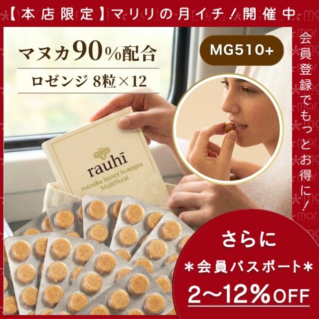 他の画像を見る 【月イチ!本店限定価格】ラウヒ ロゼンジ MG400+ マヌカハニー 飴 キャンディー 8粒×12個 Rauhi(ラウヒ) マヌカハニー MG400+ を90%配合!モノフローラル のど飴 はちみつ ニュージーランド産 マリリニュージーランド【送料無料】【ネコポス】 【本店限定!会員パスポートでさらに最大12%OFF】 当店通常価格 ¥ 13,800 販売価格 ¥ 8,000 税込 会員様はさらに2%OFF! ¥ 7,840 税込 販売期間 2026/04/24 17:00 〜 2026/05/08 11:59 詳細を見る お気に入りに登録する