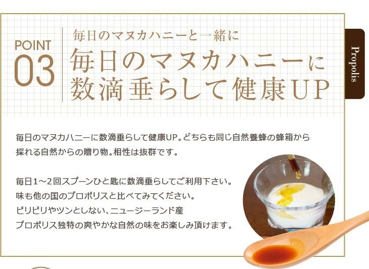 抗菌効果があるので時々使っているのですが無くなったので新しく購入しました。スポイドでとても使いいやすいです。ポロポリスは匂いが強い性格ですので、今はコロナ感染防止もあって朝夕1滴ずつヨーグルトに入れています。とても信頼できる商品だ思います。