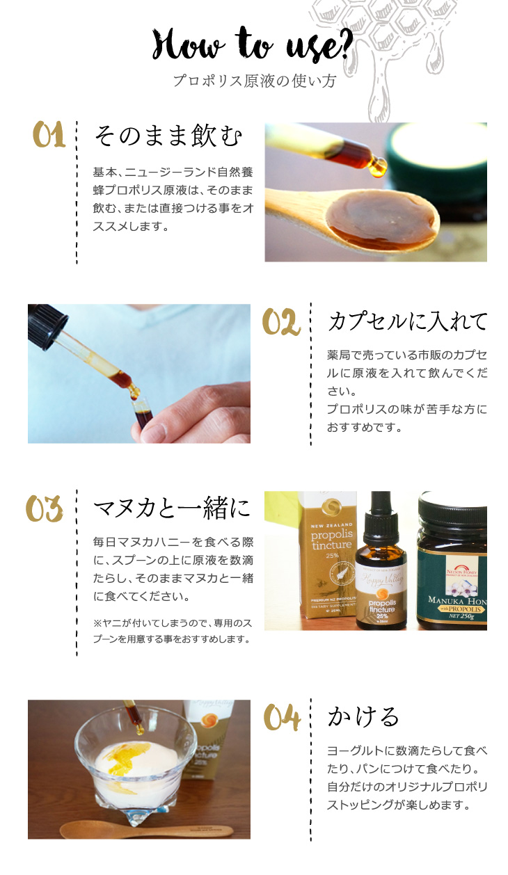 普段はマヌカハニーに一滴垂らしていただきます。健康の為にこれからも続けていきたいです。