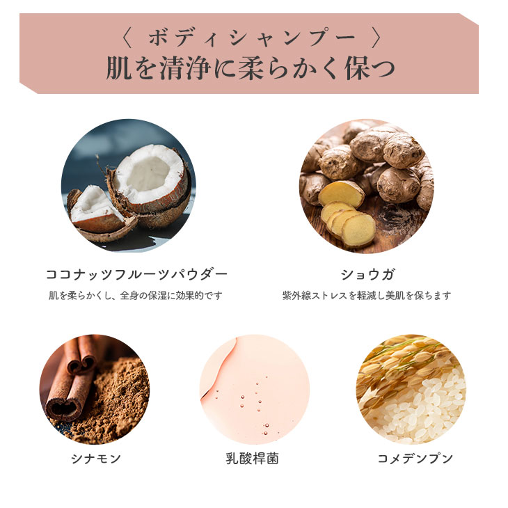 ココイルイセチオン酸Na、コメデンプン、ココヤシ果実、セイロンニッケイ樹皮、ショウガ根、α-グルカン、乳酸桿菌、マルトデキストリン、ポリムニアソンチホリア根汁