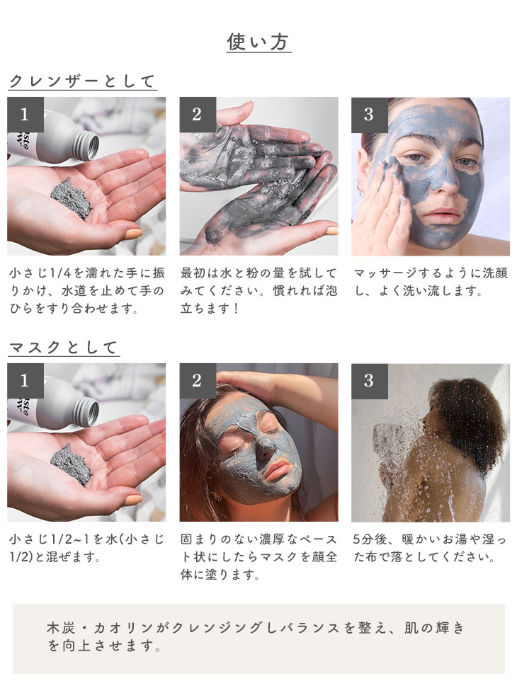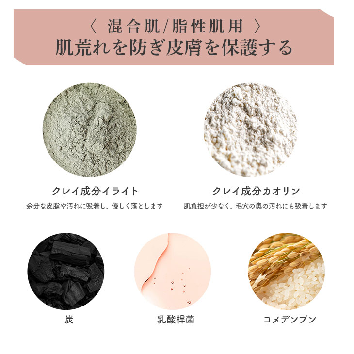 コメデンプン、カオリン、ココイルイセチオン酸Na、炭、イライト、キサンタンガム、α-グルカン、乳酸桿菌、マルトデキストリン、ポリムニアソンチホリア根汁
