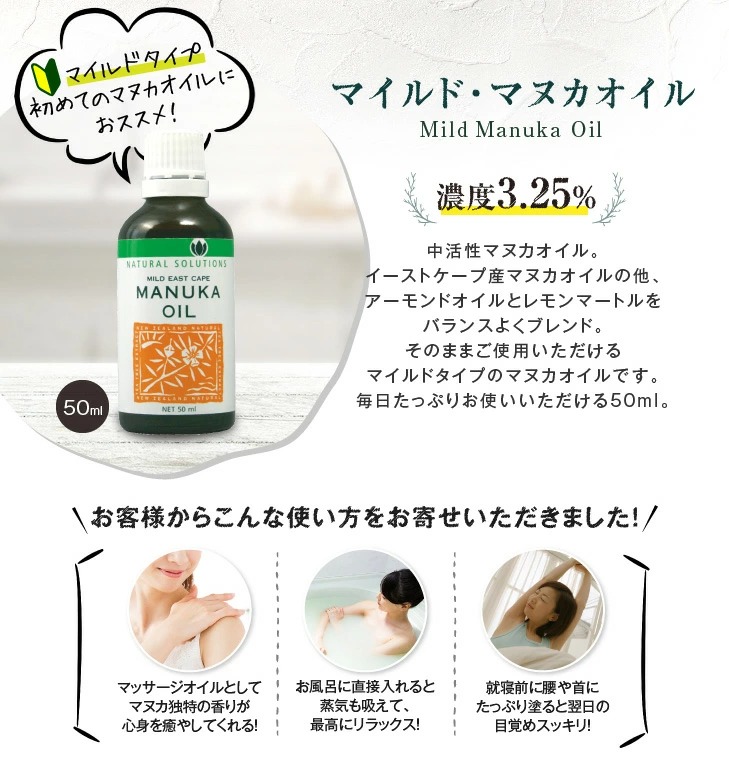 今なら10%OFF! マヌカ オイル マイルド 50ml 1本 濃度3.25% ニュージーランド イーストケープ産 虫避けやアロマに マリリ 精油 【本店限定!会員パスポートでさらに最大12%OFF】