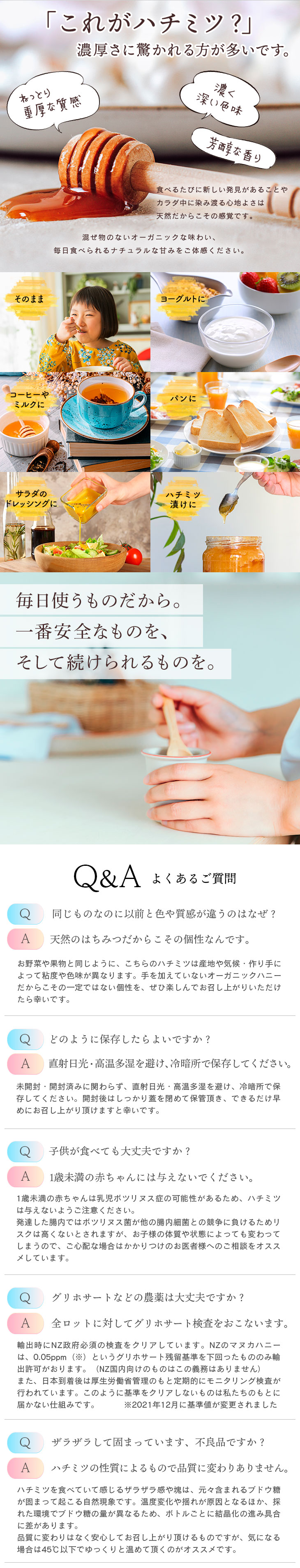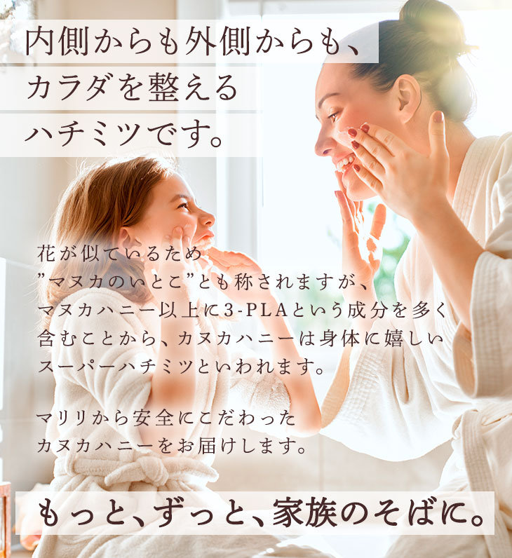 リニューアルオープンおめでとうございます。今回、会員登録をして良かったです。 お勧め商品案内と、担当の方の丁寧な近況文がとても楽しみになりそうです。購入も増えそう。 先日、間違って手の親指に高熱湯をかけてしまい、赤く腫れて痛い火傷してしまいました。 その時、どうかな?と思いなから、肌に良いとの事を読んだことが有り、、近くに蜂蜜が有り応急的に塗ってみました。 そうしましたら就寝時は、はじの塗り残した部分以外は、何も無いくらいになっていました。とても驚きです。 蜂蜜を食べていて、少し寝つきが良くなり、肌が少しキレイになった気がします。 自然なキャラメル感が有り(時期により少し異なりますが)どちらにしても食べやすいです。 他社と比べて癖もなく美味しく感じます。品質も良いので良心的だと思います。 対応のスタッフの方も丁寧で、素敵なお店です。 これからも、時々で良いので振り向かれるような体系で有りたいです。また、他に効能が有るようで少し楽しみにしています。